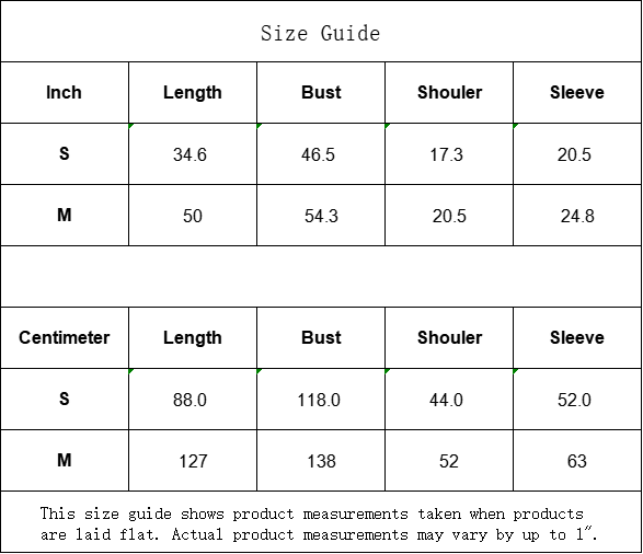 | Centimeter | Length | Bust | Shouler | Sleeve |