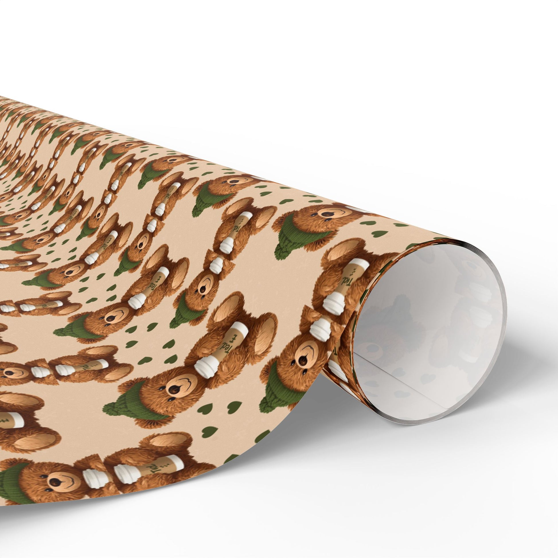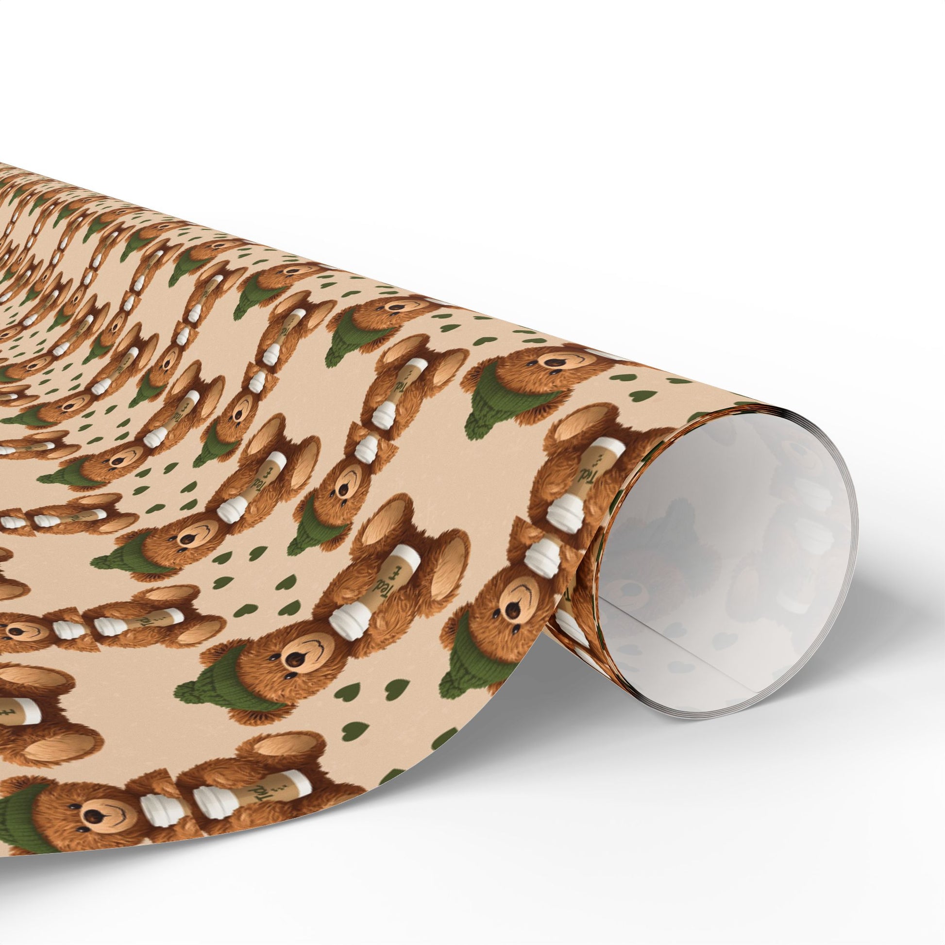 Hand-illustrated teddy bears march across warm, beige paper—tiny green scarves and soft brown fur repeating in a cozy, vintage-inspired pattern. This wrapping paper brings a nostalgic, handmade vibe to gift-giving: gentle colors, charming character faces, and a fine art paper texture that feels substantial in the hands. Use the glossy option for a lively, reflective finish that highlights the colors, or choose matte for a soft, museum-quality look. Sizes range from a handy sheet to long rolls for larger presents, and each sheet is printed one-sided with a small white trim at the edge that holds a barcode and QR code.